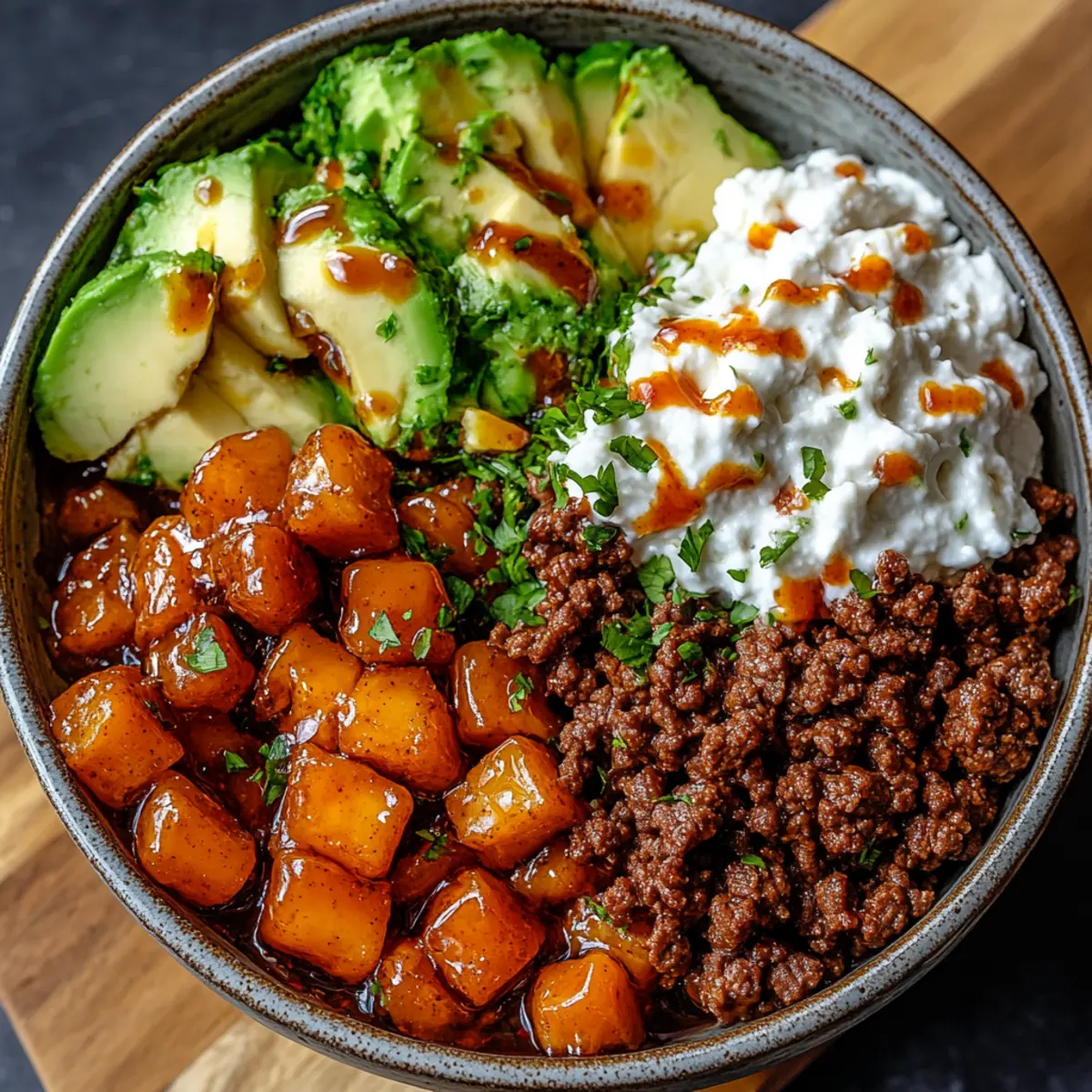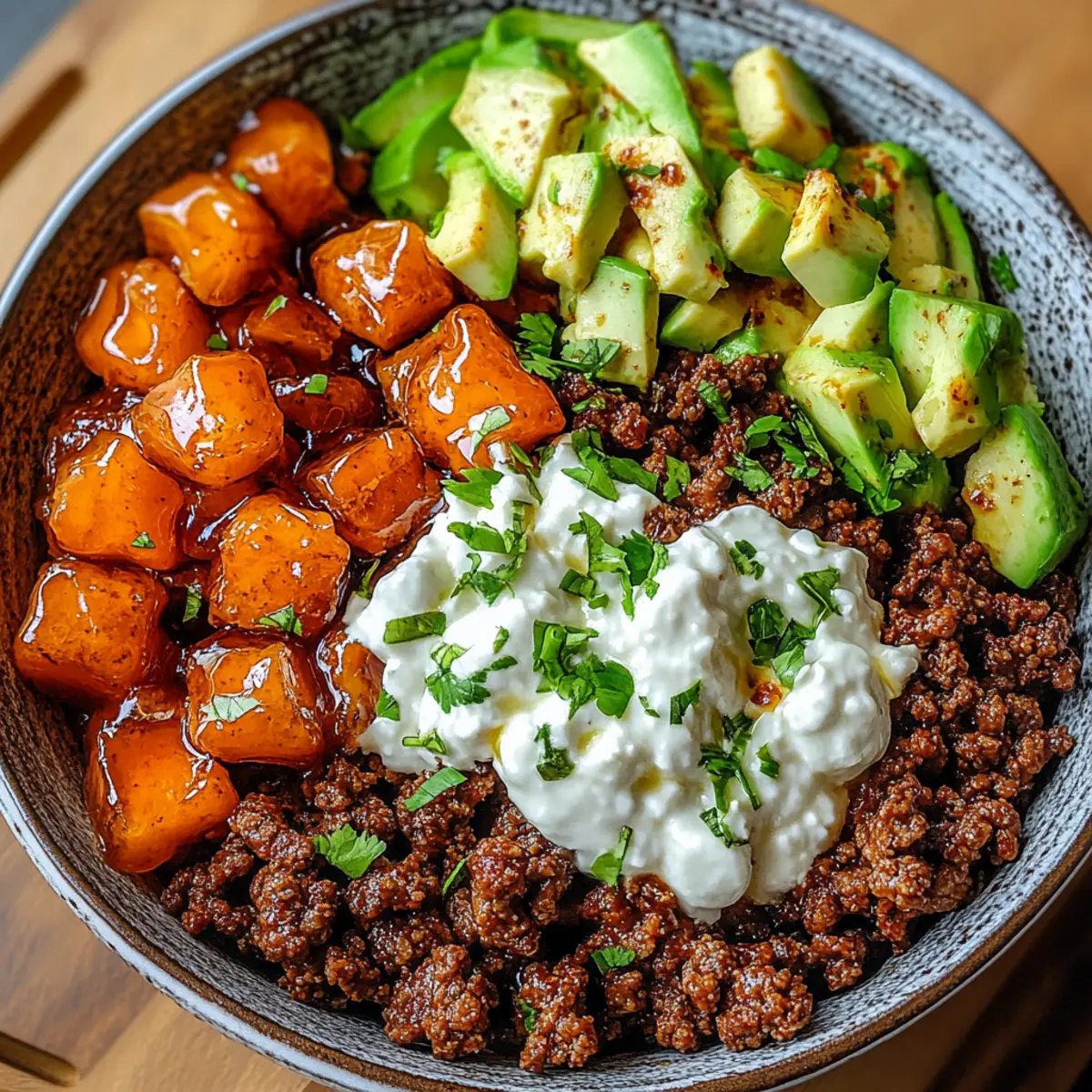 Assembla il bowl: inizia con uno strato di patate dolci rosolate, seguite dalla carne di manzo ben condita. Aggiungi la ricotta e l’avocado sopra, creando un mélange di consistenze e sapori.