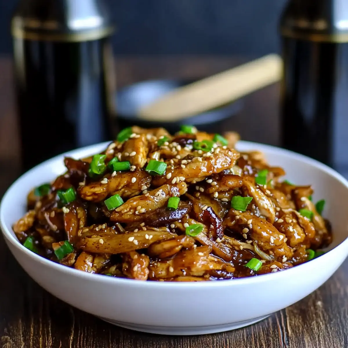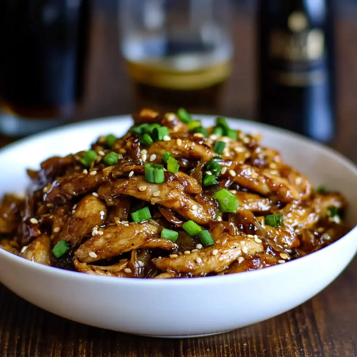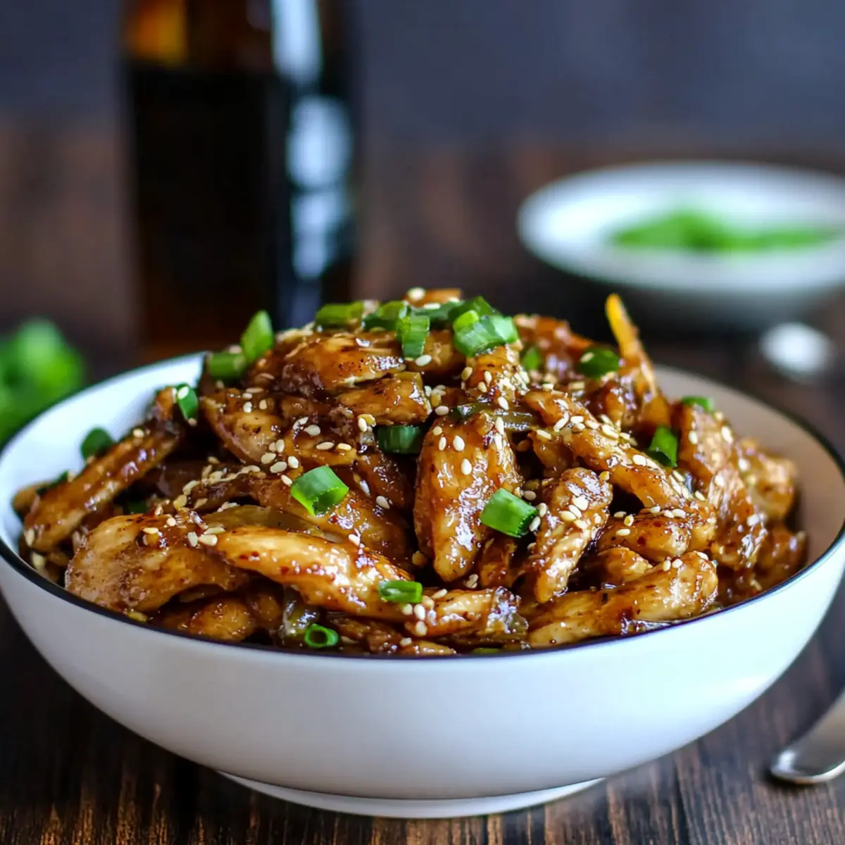 Versare la salsa addensata sul pollo stracciato; mescolare per combinare e guarnire con cipollotto e semi di sesamo prima di servire.
