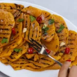- Assembla il piatto: Disponi le fette di zucca grigliata in una pirofila e irrorale con il condimento. Copri e lascia insaporire almeno un’ora a temperatura ambiente, così gli aromi penetrano bene nella polpa.